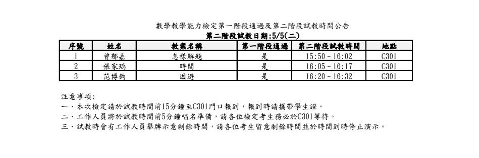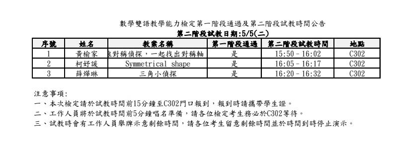 數學教學能力檢定(中文、雙語)第一階段通過及第二階段試教時間公告